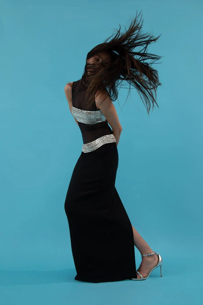 Crystal embellished crepe and mesh maxi dress