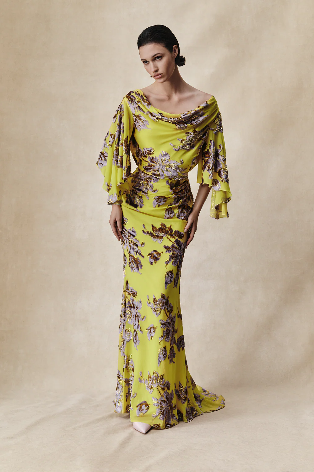• A floral devoré velvet maxi dress with a softly draped cowl front and elbow-length flared sleeves. Gentle gathering at the waist shapes the figure and highlights the hips. The open back is secured with fine ties at the neck. The skirt falls into a subtle flare and finishes with a fluid, trailing train.