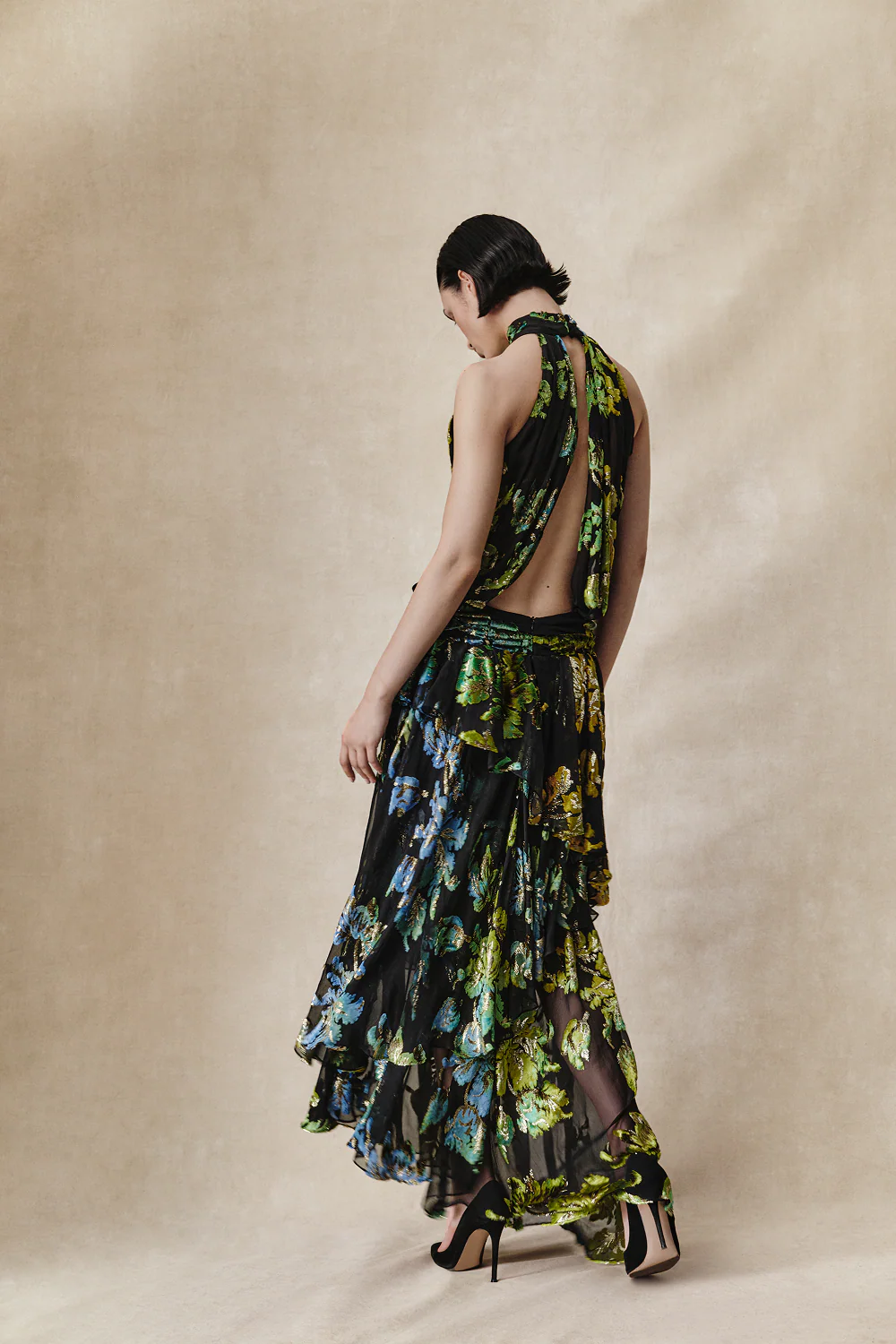 • A floral devoré velvet maxi dress with a halterneck. Soft draping falls over the bodice at the front, while gentle gathering at the waist shapes the silhouette. The skirt is finished with a cascading tiered ruffle and an asymmetric hem, adding light, fluid movement as you walk.