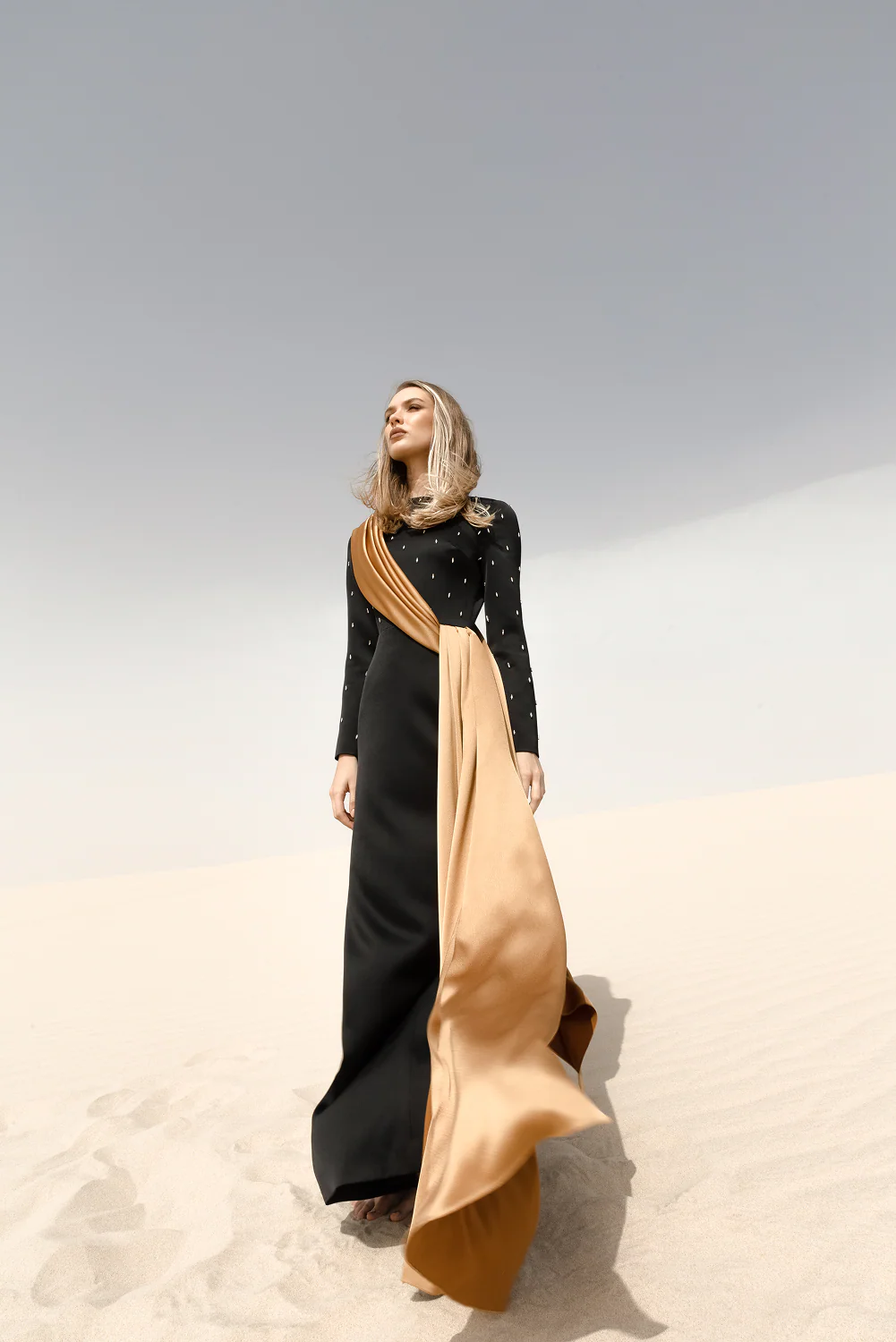 •  Asymmetrical dress with a straight neckline, voluminous shoulder srapery and folded skirt. Will fit for festive, evenings and ceremonial occasions.