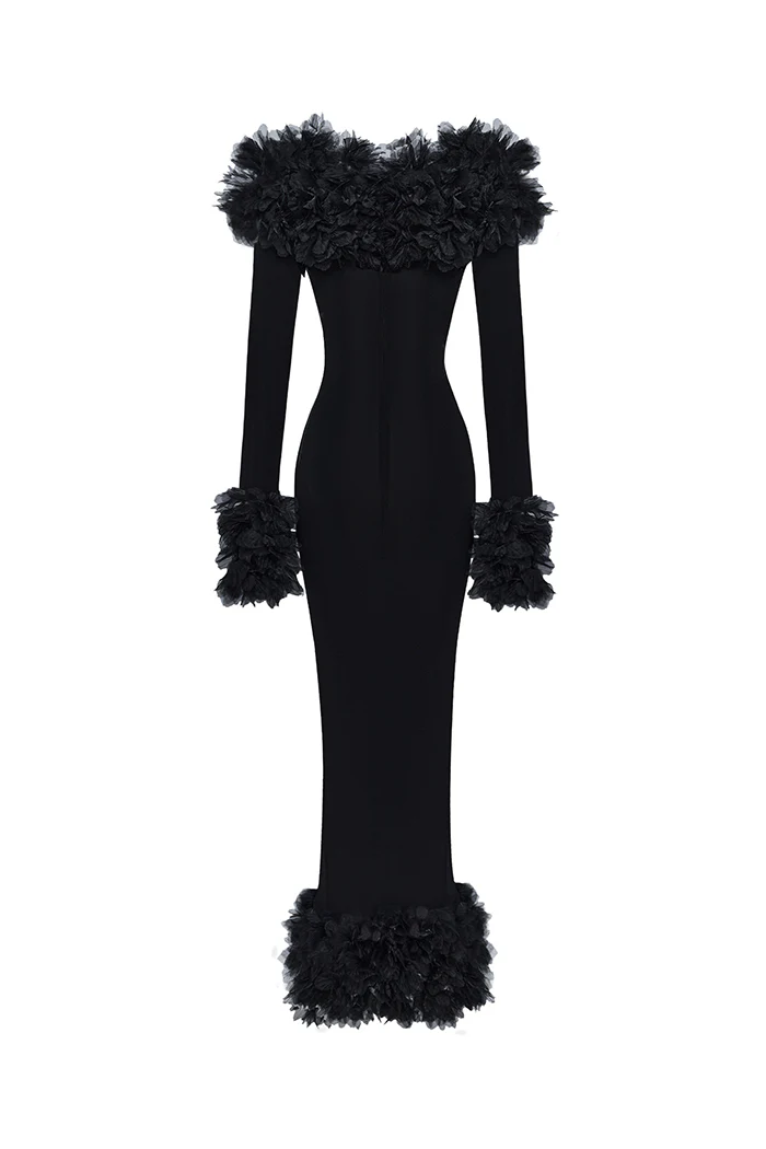 ā¢Ā Ā This maxi dress is crafted from soft knit fabric that hugs and accentuates the figure. Floral appliquĆ©s adorn the dĆ©colletage, sleeves, and hem, adding a playful touch and creating a dramatic silhouette, perfect for evening occasions.