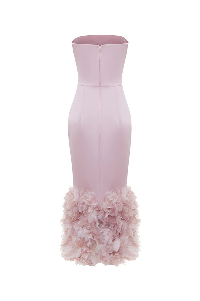 ⢠ This satin midi dress is designed to flatter the figure, gracefully highlighting its natural curves. The fitted silhouette exudes timeless elegance, while the hem, adorned with voluminous floral appliqués, adds a touch of charm and whimsy to the look.