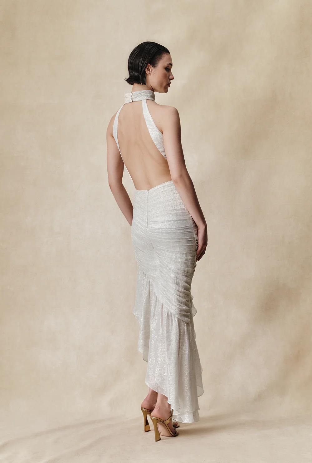 ā¢Ā Ā A maxi dress in silk chiffon with lurex, finished with a halterneck that frames the shoulders. Soft draping wraps the bodice and skirt, gathering gently at the hip before flowing into a cascade of asymmetric ruffles. An open back completes the look with an effortlessly feminine finish.