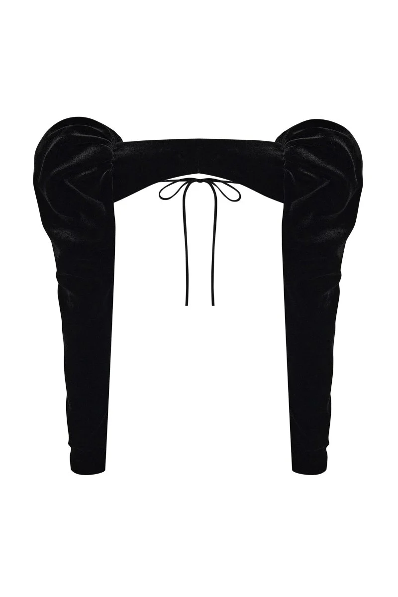 ā¢Ā Ā The puff sleeves of this stylish velvet bolero are gathered into folds, creating a striking silhouette that adds dynamism and drama. The piece ties at the front with a thin ribbon, allowing for adjustable fit and added comfort. This bolero pairs perfectly with the open-back dresses from the new collection, bringing extra elegance and practicality to your look.