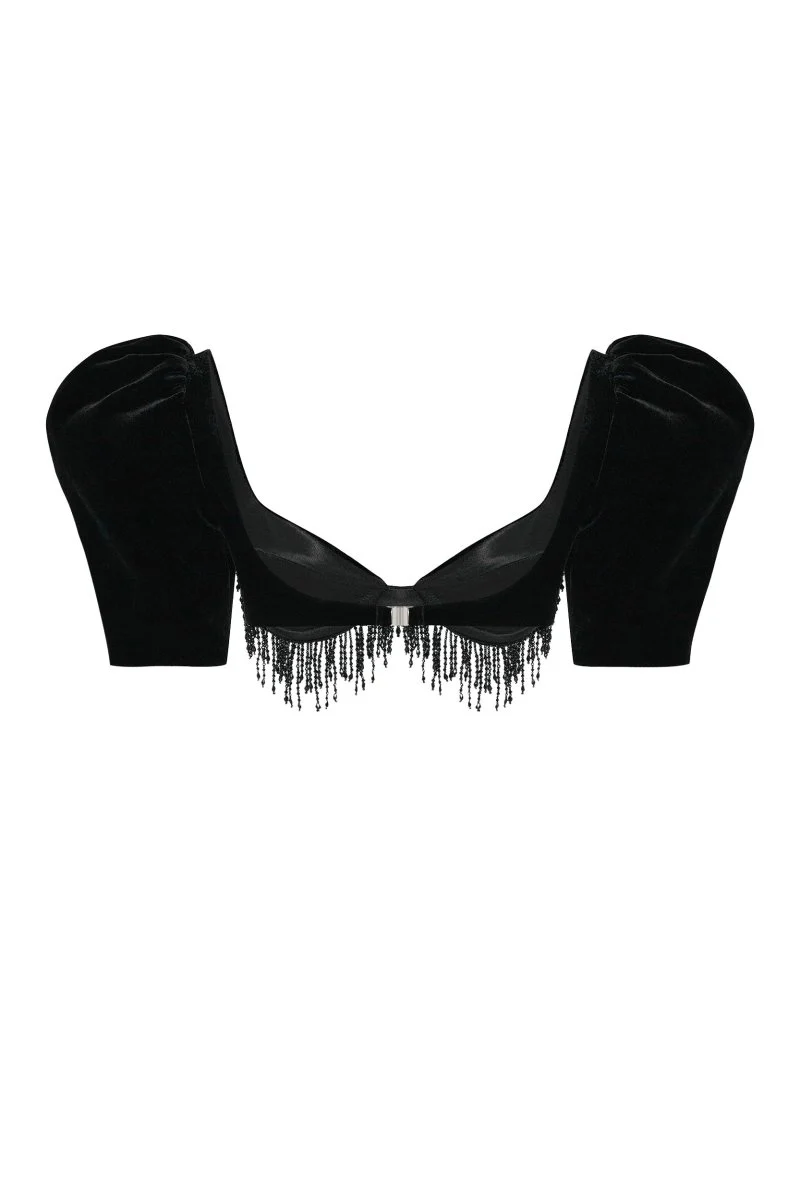 ⢠The deep neckline of this cropped velvet top accentuates the décolletage and highlights the collarbones. The cups are adorned with beaded fringe, introducing a dynamic touch. The puff sleeves draw attention, making this top the focal point of any outfit, while the velvet texture provides depth and luxury.